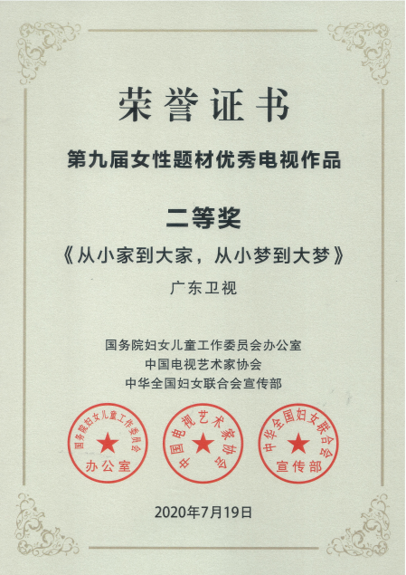 日前,官金仙董事长个人纪录片《从小家到大家 从小梦到大梦》荣获第九届女性题材优秀电视作品二等奖,该奖项由国务院妇女儿童工作委员会办公室、全国妇联宣传部、中国电视艺术家协会联合颁发,意在坚持和完善促进男女平等、妇女全面发展的制度机制,充分展现妇女事业发展的新成就和新时代妇女的新作为。